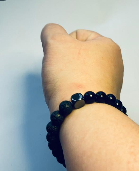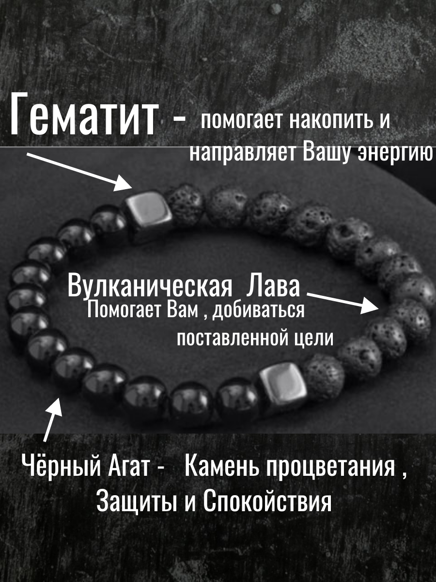 Матовый черный агат символизирует стойкость и защиту, вулканическая лава несет энергию природы и решимость, а гематит добавляет металлический блеск, подчеркивая мужественность и стиль.